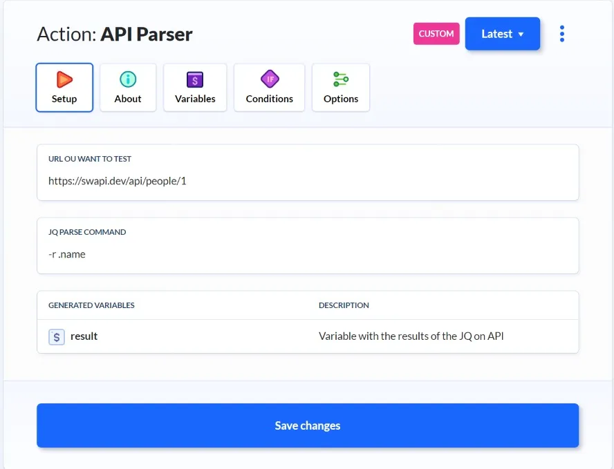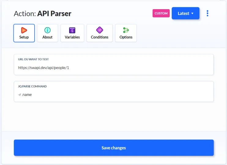 This time, we’ll create something more complicated. This action will get data from a given API then it will be parsed with jq and in the end, we will pass the result to another action.