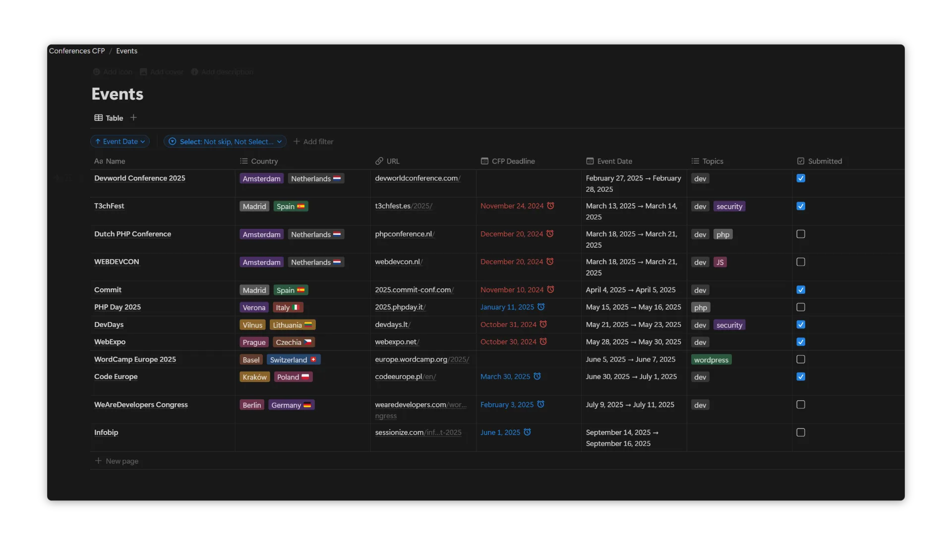 To keep everything in order, I use Notion. I have a database with events, dates, and statuses (did I submit a talk already, skip an event, etc.). The cool part about Notion is that I can switch from a table view to a calendar view, which is very useful for learning if conferences are overlapping. I also use reminders—they are very useful for reminding me about CFP deadlines.