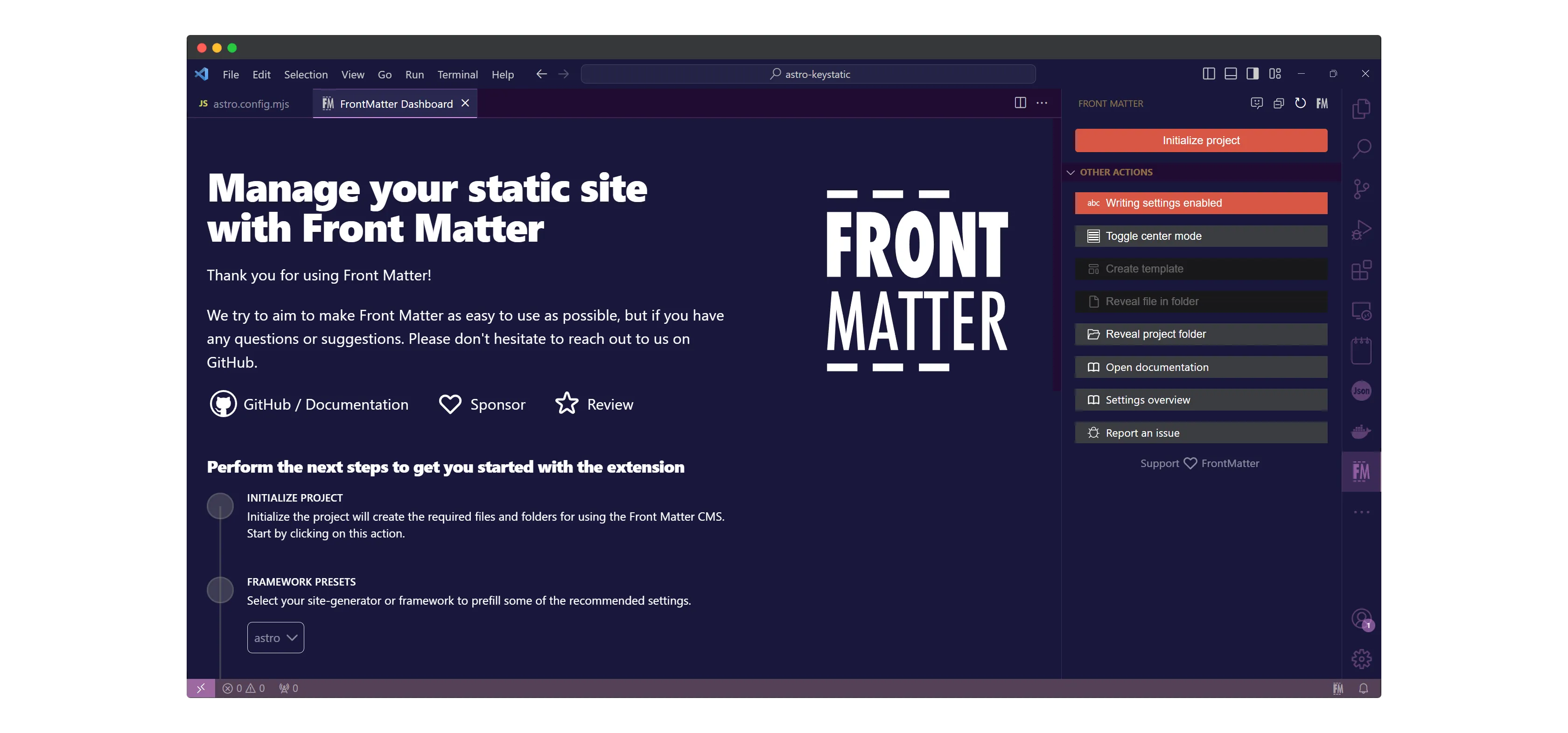 After installation, it’s time to open a project that you want to use with Front Matter CMS. After doing so, press the FM icon in the sidebar and follow the instructions. At this point, the basic configuration is almost done.