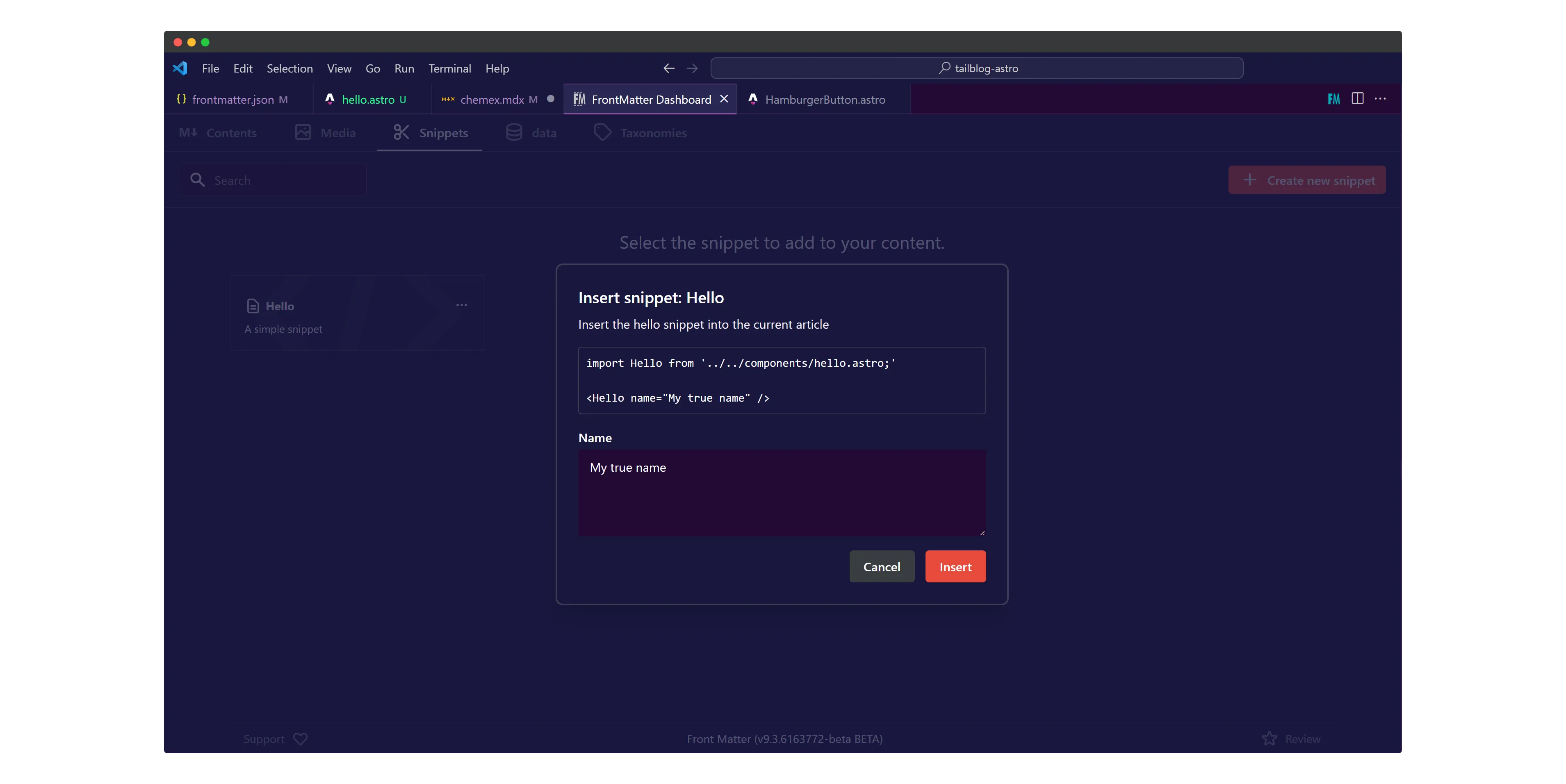 Snippets are a fantastic way to stop repeating yourself. It works really great with MDX files and components. So, let’s create a simple component that will show Hello [your name].