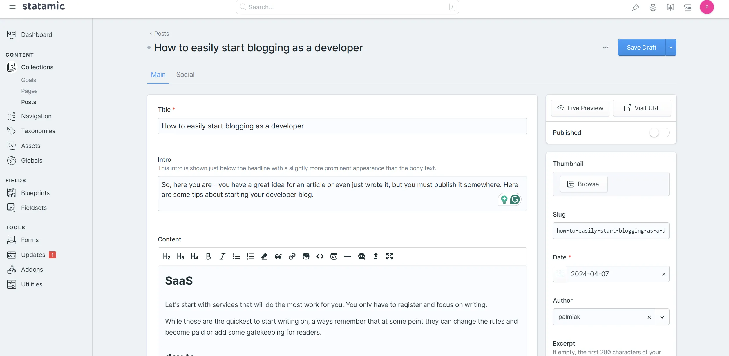 With WP, you’ll just need a bit more fuss to get it working exactly as you want - probably you’ll need a code highlighter block and some other plugins to make everything as you imagined. While that’s not a problem, you can do it quite quickly, the bigger problem is the database. The thing I loved so much about Statamic was the lack of it. The database adds some problems with moving stuff around from localhost to production (there are plugins that can help here).