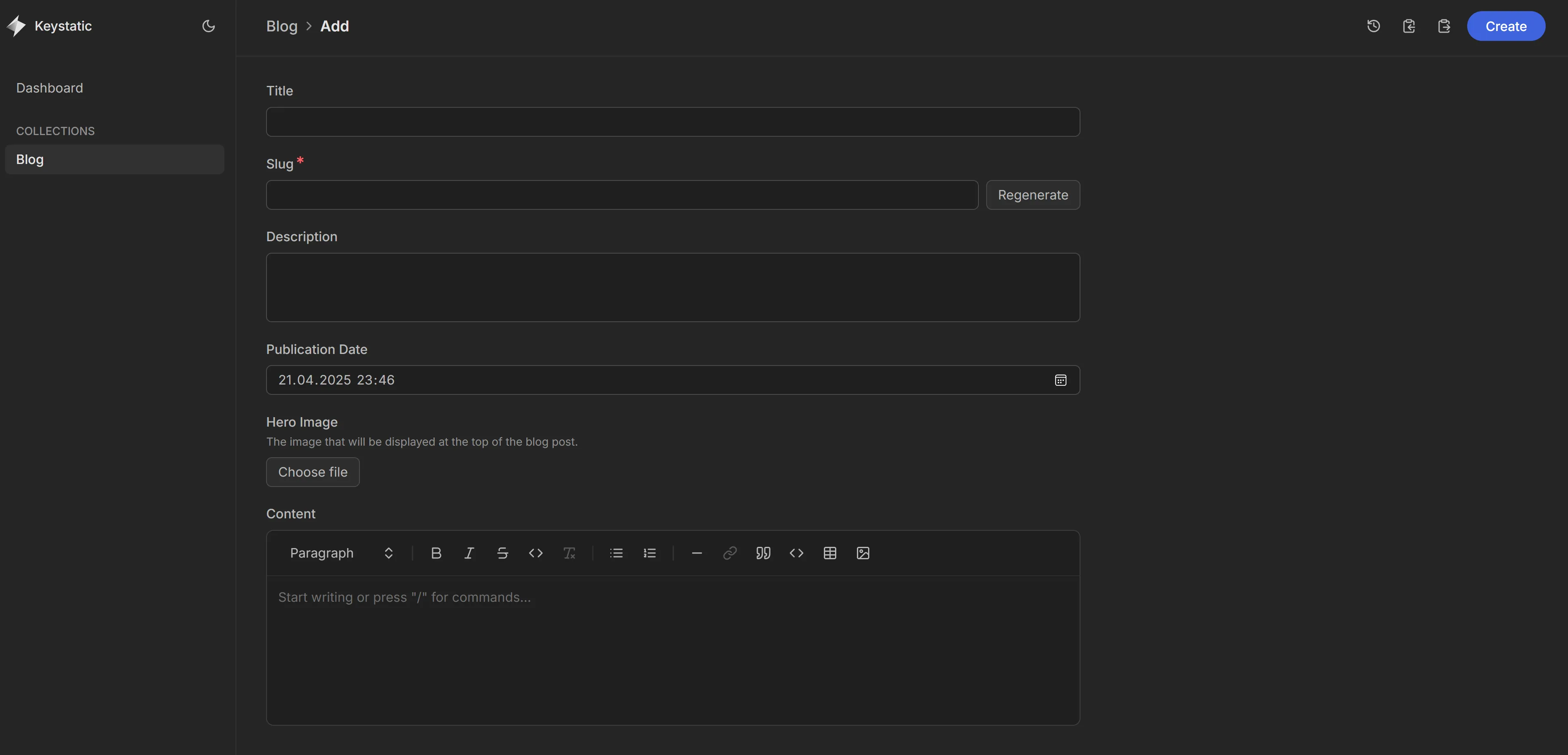 By default, Keystatic is using the entryLayout: form option. It results in having all your fields stacked on top of each other. But our page is a blog, so we want our content fields to be the most important one.