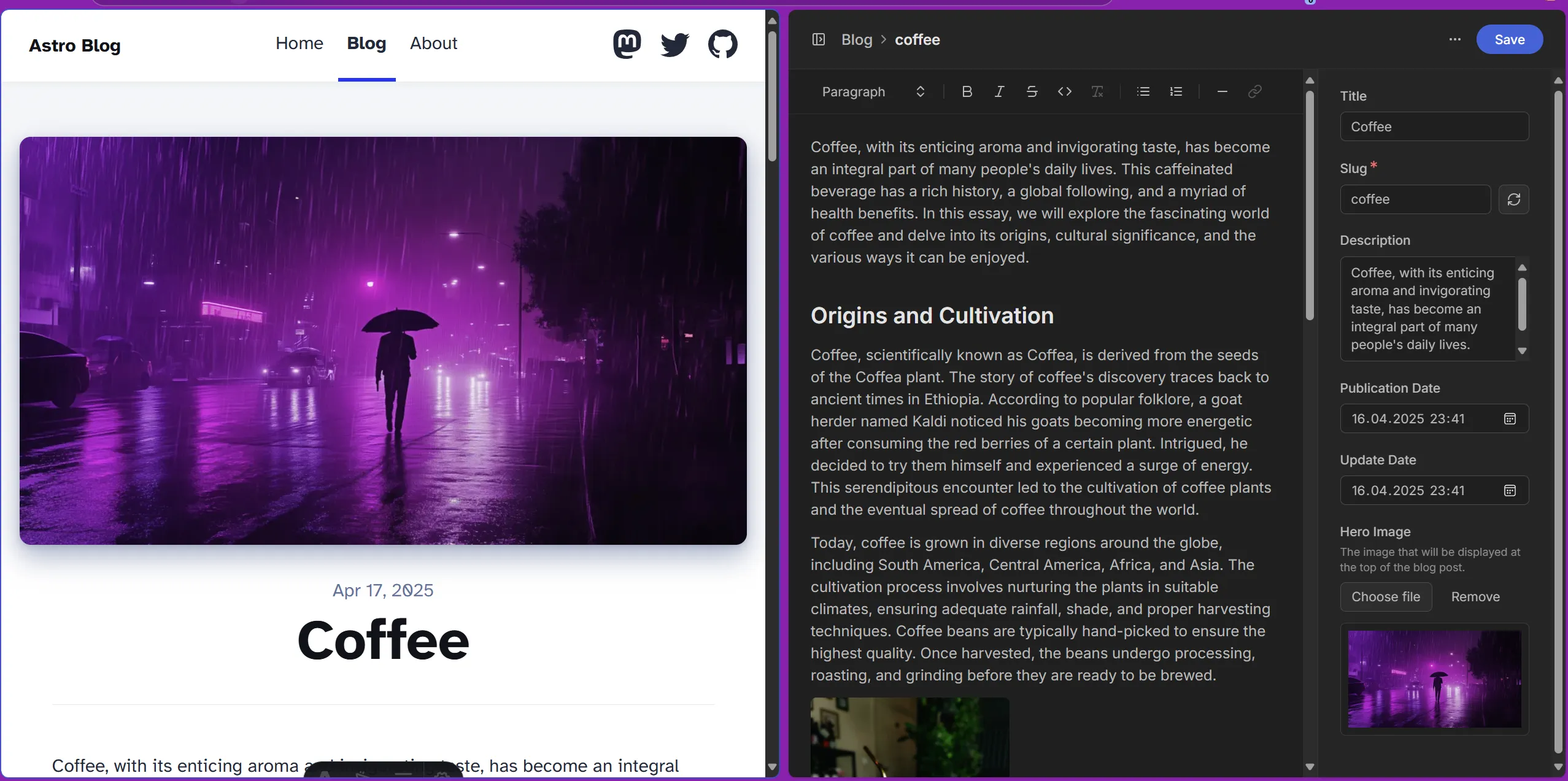 Because of how Keystatic works, using files, connecting it with Astro is very simple. You still use Astro as usual, the only difference is that you edit content files in a different way.