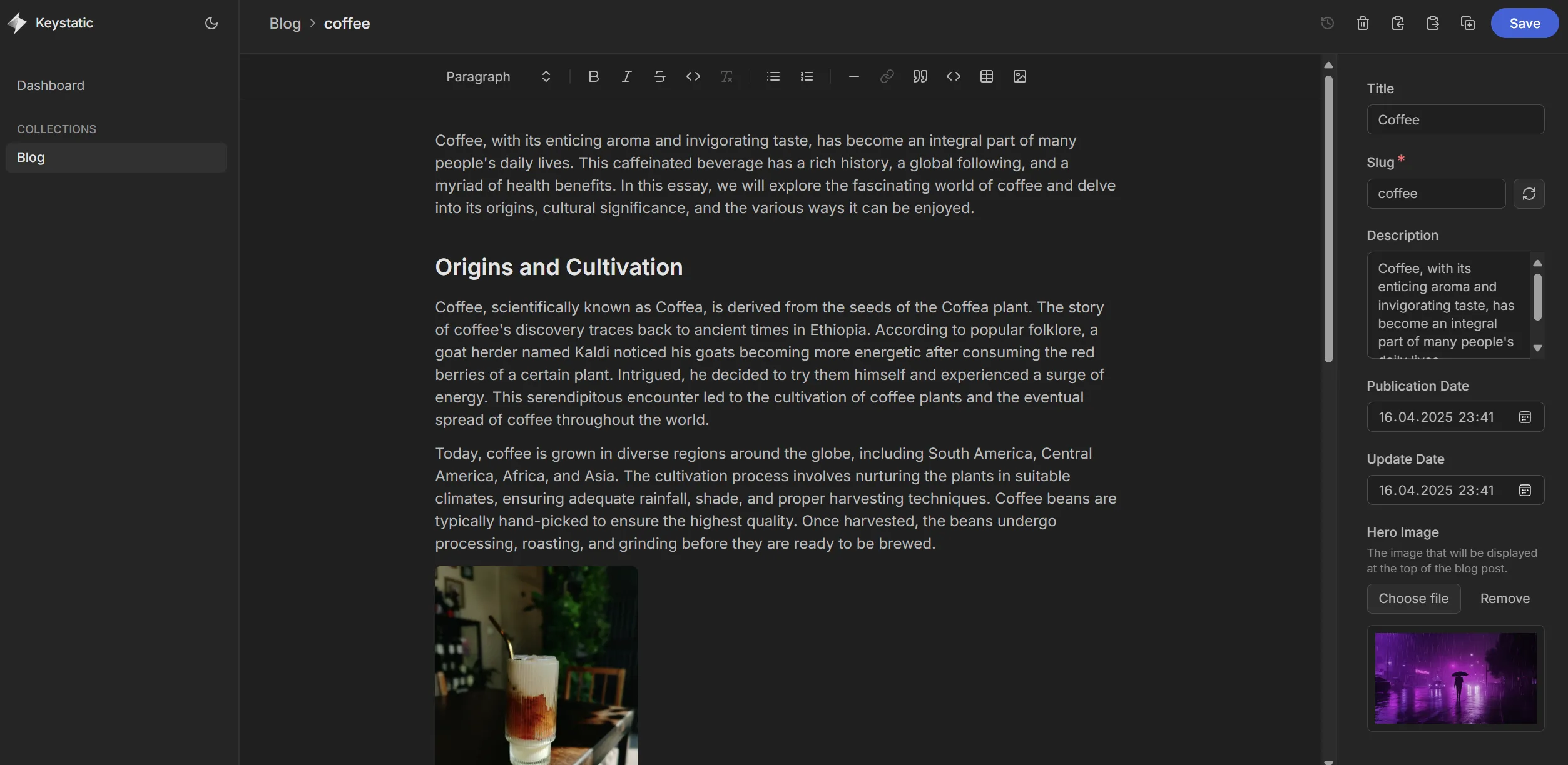 Keystatic is very minimalistic. Personally, I like it - it lets you focus on writing instead of getting constantly distracted.