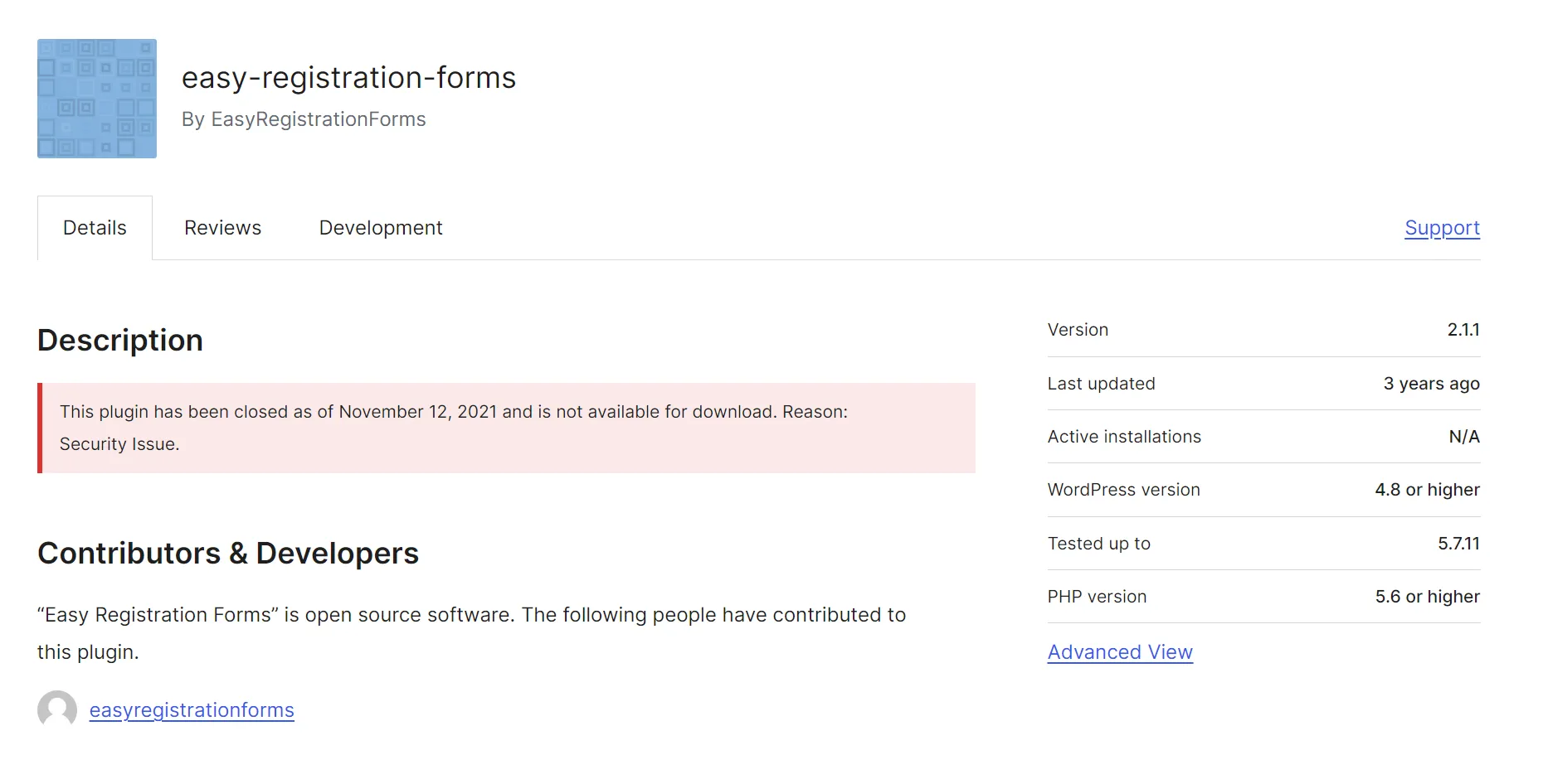 "description": "This plugin has been closed as of November 12, 2021 and is not available for download. Reason: Security Issue.",