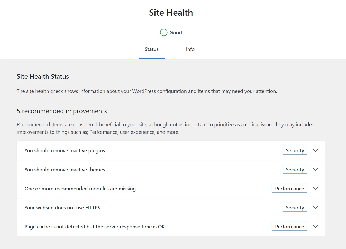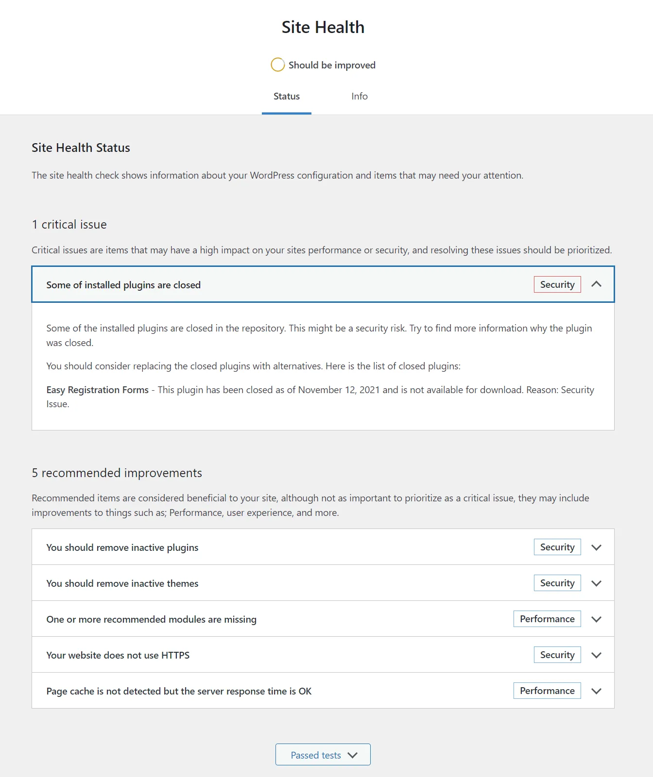 Let’s also check the Site Health screen because there are some security tests