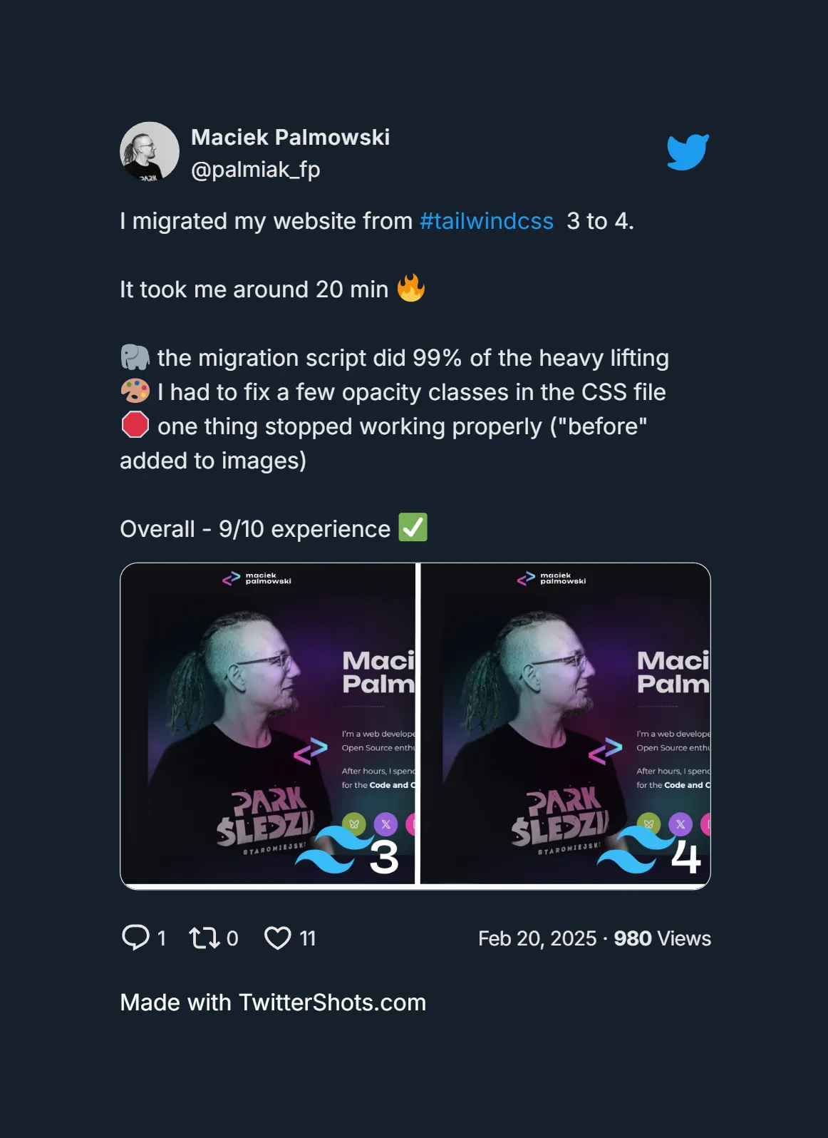 Overall the migration went smoothly. Running npx @tailwindcss/upgrade took care of most of the heavy lifting. I just had to change a few class names in the CSS file and I was done.
