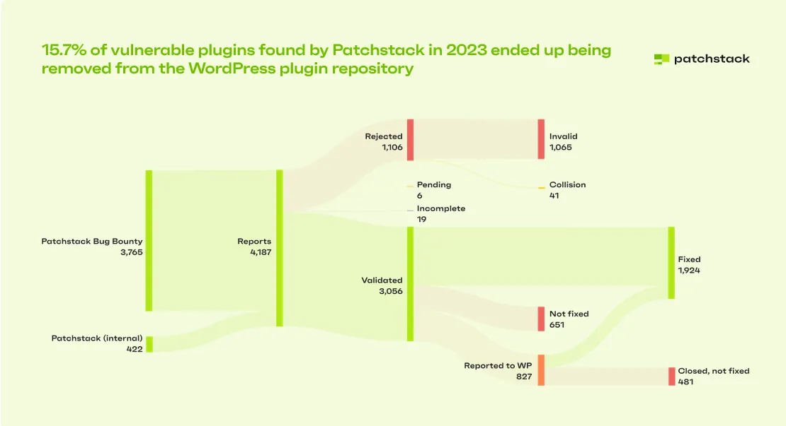 Last year there were around 6k vulnerabilities found in the WP ecosystem, compared to 2022 it increased from 4.5K. While that doesn’t seem like an improvement, it means that we can find and remove more vulnerabilities. Also, a lot of them disappear from the repo.