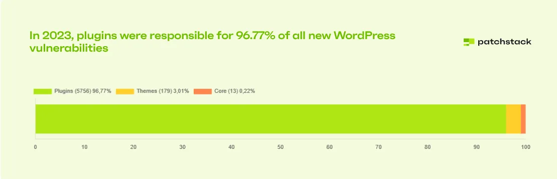 The WordPress ecosystem consists of (simplifying a bit) core, plugins, and themes. While the core is not a problem, the plugins and themes are. They generate almost 99% of vulnerabilities in the ecosystem.